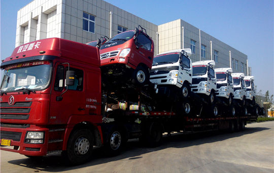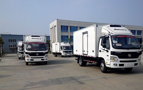 6.25日早上,一臺陜汽德龍半掛車拉載著12臺4.2米福田底盤緩緩駛入青島雅凱汽車工貿有限公司。其中9臺是青島物流公司批量采購的福田歐馬可冷藏車,3臺福田奧鈴是天津物流公司采購的雙溫藥品冷藏車。