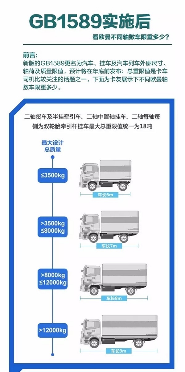 新版的GB1589更名為汽車、掛車及汽車列車外廊尺寸、軸荷及質(zhì)量限值,預(yù)計(jì)將在年底前發(fā)布:總重限值是卡車司機(jī)比較關(guān)注的話題之一,下面為卡友展示一下不同歐曼軸數(shù)車限重多少。